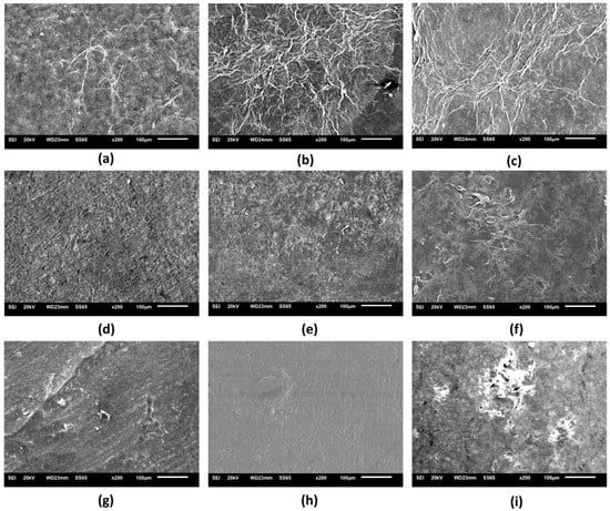 Scanning electron microscopy micrographs (200×) of the surface of the nine wound dressings based on pure BC or BC incorporated with active molecules: (a) F1; (b) F2; (c) F3; (d) F4; (e) F5; (f) F6; (g) F7; (h) F8; and (i) F9.