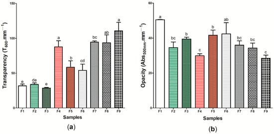 Figure 4 presents the optical properties of the nine (9) wound dressings produced, which was evaluated from the analysis of transparency (Figure 4a) and opacity (Figure 4b) (Table S1). Considering the analysis of transparency, wound dressing F1 presented one of the lowest values obtained for this analysis (31.81 ± 2.57 T600 mm−1), however, wound dressings F4 and F9 presented the highest transparency, with 87.72 ± 8.771 and 110.93 ± 12.07 T600 mm−1, respectively. Andriotis et al. [] demonstrated that lower concentrations of propolis extract in the pectin polymeric matrix promoted the obtaining of more transparent bioactive adhesives, as also observed in this study. Furthermore, the results found in Andriotis et al.’s study are similar to the pattern reported by Contardi et al. [], where increasing the concentration of p-coumaric acid in polyvinylpyrrolidone (PVP)-based films led to increased transparency. If it comes to the opacity of wound dressings, the values found ranged from 50.48 ± 0.152 (sample F1) to 28.43 ± 1.804 (sample F9) Abs500 nm-mm−1, with a significant difference (p < 0.05).