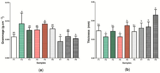 Figure 5a shows the results regarding the grammage of the nine (9) wound dressings produced, where the values found ranged between 0.004 ± 0.001 g cm−2 (wound dressing F7) and 0.009 ± 0.002 g cm−2 (wound dressing F9) (Table S1). It is important to note that there was no significant difference (p < 0.05) between the wound dressings composed of pure BC and the other eight (8) wound dressings formed from the incorporation of active components to BC, which demonstrates that the presence of ethanolic extract of propolis (green and red) or its biomarkers (p-coumaric acid and biochanin A) was not able to significantly modify the distribution of mass in a respective area. This difference may be associated with the type of molecule that was incorporated into the BC matrix, where biopolymer incorporation may result in an interaction. Considering the thickness analysis (Figure 5b), wound dressing F9 presented the greatest thickness among the nine (9) samples produced (0.0461 ± 0.005 mm), while the samples containing 2 g of green or red propolis extract had the lowest thickness, 0.0269 ± 0.004 and 0.0228 ± 0.004 mm, respectively, with a significant difference (p < 0.05) (Table S1). It is important to note that, in general, comparing sample F1 with active wound dressings (samples F2–F9), there was only a statistical difference for sample F9.