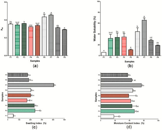 Physical and barrier properties of wound dressings F1 to F9: (a) aw; (b) water solubility (%); (c) swelling index (%); and (d) moisture content index (%). Bars followed by the same letters (a,b,c,d,e) were not significantly different considering <0.05 as p value, according to Tukey’s test with 95% confidence.