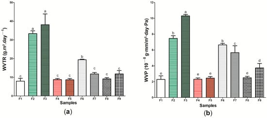 Physical and barrier properties of wound dressings F1 to F9: (a) WVTR (g m2 day−1) and (b) WVP (10−8 g-mm/m2-day-Pa). Bars followed by the same letters (a,b,c,d,e) were not significantly different considering <0.05 as p value according to Tukey test with 95% confidence level.