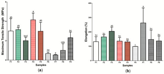 Tensile mechanical properties of wound dressings F1 to F9: (a) maximum tensile strength (Mpa) and (b) elongation (%). Bars followed by the same letters (a,b,c,d,e) were not significantly different considering <0.05 as p value according to Tukey’s test with 95% confidence level.