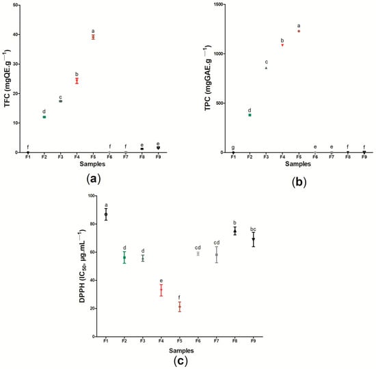 Determination of (a) TFC (mgEQ g−1), (b) TPC (mgGAE g−1), and (c) antioxidant activity (DPPH-IC50 μg mL−1). Values showing the same letter (a,b,c,d,e,f) in the same analysis do not show significant differences (p > 0.05) based on Tukey test at 95% confidence level.