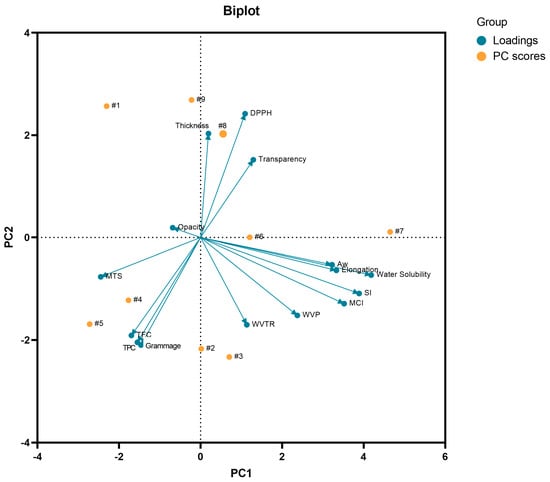 All data from the characterization assays were presented as mean values ± standard deviation, since at least three independent analyses were performed. The results obtained related to the characterization of wound dressings were analyzed for 95% (p < 0.05) significance, and results that showed significant differences between treatments were differentiated by Tukey’s post-test. Analysis of statistical significance was determined by ANOVA and Tukey-test. To analyze the influence of the insertion of the active substances (propolis extracts or the isolates), the principal component analysis (PCA) was performed, using the means of the characterization analyses (aw, weight, water solubility, swelling index, moisture content index, WVTR, WVP, opacity, transparency, thickness, elongation, tensile strength, TFC, TPC, and DPPH radical scavenging capacity). However, since the variables evaluated had different units of measurement, the data for the aforementioned characterization tests were normalized in the range of 0 to 1, and after normalization, PCA was performed. Considering the in vitro retention analysis, the comparison between the concentration of biomarkers (p-coumaric acid and biochanin A) in the stratum corneum and in the viable skin through passive permeation of the wound dressings was carried out using the Bonferroni test. All statistical analyses were performed in GraphPad Prism software (version 9.2; San Diego, CA, USA).