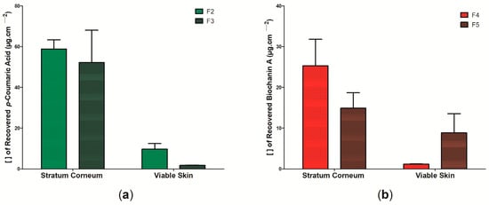 After the skin permeation experiment, the amount of biomarkers (p-coumaric acid and biochanin A) that remained retained in the stratum corneum of the skin was determined and differentiated from the content retained in the viable skin. For this, the tape stripping technique was used, where the pig skin was removed from the diffusion cell, stretched, and stuck on a Styrofoam support. The stratum corneum of the drug transport area was completely removed with the help of 15 tape strips, and the viable skin was minced. Both layers were transferred to amber glass vials, from which the markers were extracted by the addition of 5 mL of methanol. The flasks were capped and left to stand for 24 h at room temperature (25 °C). After this period, their content was filtered on hydrophobic filters with porosity of 0.45 µm and analyzed by HPLC for quantification of p-coumaric acid (for samples F2, F3, F6, and F7) and biochanin A (for samples F4, F5, F8, and F9), the biomarkers under study.