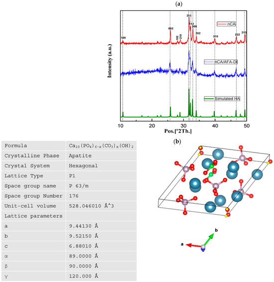 PXRD spectra of nCA and nCA/AFA. (a) PXRD patterns of nCA (red), nCA/AFA (blue), and simulated HA (green). (b) Hexagonal crystalline morphology of the synthesised nCA, with calcium (blue), phosphorous (purple), carbon (green), oxygen (red), and hydrogen (yellow), using the Vesta program and its lattice parameter.