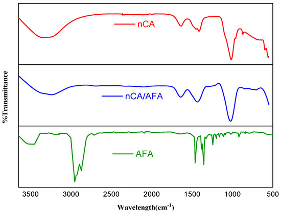 FTIR spectra for nCA (red), nCA/AFA (blue), and AFA (green).