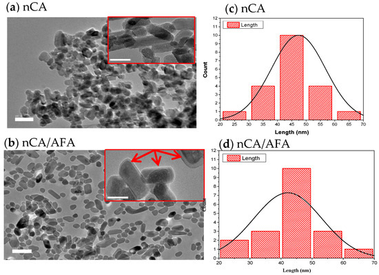 The HR-TEM analysis was used to determine the size and shape of nCA and nCA/AFA, as shown in Figure 4. The observed morphology of the nCAs shows a rod-like crystalline, uniform porous surface structure with an average diameter of 47.36 ± 3.16 nm. Adding afatinib to nCA decreases the particle size to the average diameter of 42.97 ± 2.78 nm, which may confirm AFA loading into nCA as it will reduce the aggregation of the nCA (Figure 4a,b). This can be attributed to the drug, which may act as a surfactant and prevent aggregation of nCA [33,34,35]. Furthermore, the measurement size obtained for nCA and nCA/AFA agreed with the Gaussian distribution size obtained for nCA and nCA/AFA, ≈47 and 42.61 nm, respectively (Figure 4c,d).