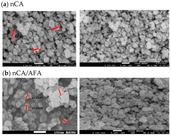 The surface morphological characterisation of nCA and nCA/AFA from FESEM graphs is shown in Figure 5. The nCA demonstrated agglomerated, nearly rod-like shaped nanoparticles, and this fine agglomeration is due to the van der Waals force attraction between nCAs.