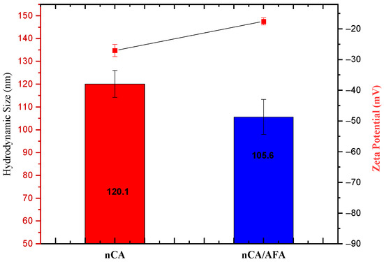 Particle size and zeta potential are the main parameters for nanoparticle performance, used to passively target therapeutic agents into cancer cells [40]. The tumour vasculature has a more heterogeneous distribution, higher vascular density, larger size, and is more permeable and leaky [41]. Many studies suggested that nanoparticles with a size smaller than 150 nm tend to extravasate from circulation and accumulate within tumours [42]. The experimental determination for the hydrodynamic diameter of the nCA was 120.1 ± 5.92 nm, and nCA/AFA was 105.6 ± 7.69 nm. The sizes classified both the nanocarrier and nanocomposite as promising candidates for passive targeting. Although, the hydrodynamic diameters for both nCA and nCA/AFA were higher than the HR-TEM sizes because the nanoparticles’ hydration layer is included within the calculated size [43,44], or possibly due to the aggregation of nanoparticles in deionised water [45].