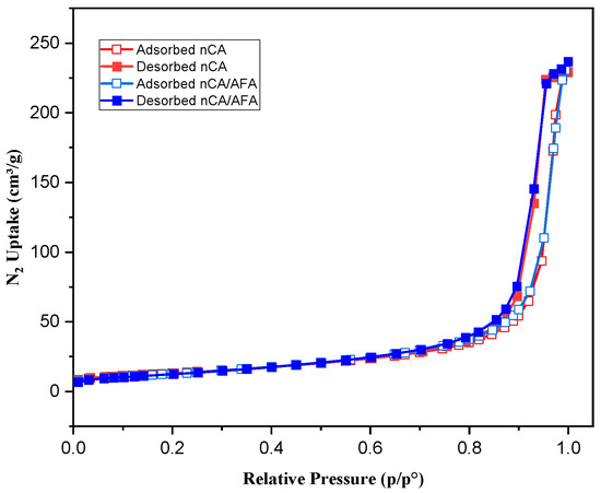 N2 adsorption/desorption is a well-established analysis used to characterise porous solids and fine dry powders [47]. BET analysis measures the sample-specific surface area, including the pore size distribution, to estimate the dissolution rate and bioavailability [48]. Depending on the IUPAC classification system, the resulting isotherms from N2 adsorption/desorption obtained for nCA and nCA/AFA were type IV isotherms (Figure 8). The hysteresis loop was H1, indicating that the nanoparticles and nanocomposites are mesoporous [49]. The synthesised nCA- and nCA/AFA-specific surface areas, BIJ pore width, and pore volume are presented in Table 2. The decrease in surface area and pore volume for nCA/AFA confirms the drug’s loading into nanoparticles rather than on nanoparticle surfaces.