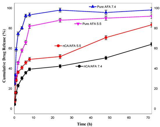 For in vitro release, nCA/AFA and pure AFA samples were calculated at physiological (pH 7.4) and acidic (pH 5.5) conditions in PBS at 37 °C for 72 h. The release profile (Figure 9) demonstrates that after 1 h, 58.5% ± 2.5% and 32.04% ± 3.2% of pure AFA were released at pH 7.4 and 5.5, respectively. In contrast, AFA was released from nanocomposite nCA/AFA at pH 7.4, only 15.45% ± 3.9%, and 28.4% ± 3.1% at pH 5.5. Interestingly, AFA was released from nCA/AFA three-fold slower than the pure AFA [50]. Sequentially, at 72 h, 99.5% ± 8.3% and 83.3% ± 5.7% of pure AFA were released at pH 7.4 and 5.5 [22]. In comparison, after 72 h, 63.7% ± 5.1% and 81.3% ± 2.6% of AFA were released from nCA/AFA at pH 7.4 and 5.5, correspondingly.