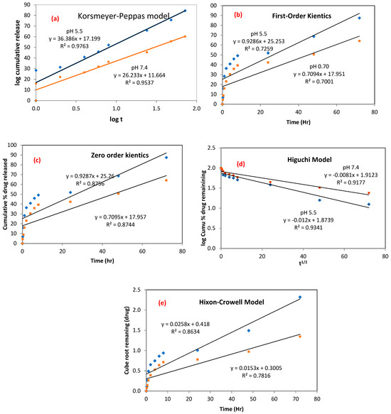 Kinetics drug release from nCA. (a) Korsmeyer–Peppas, (b) first-order kinetics, (c) zero-order kinetics, (d) Higuchi, and (e) Hixson–Crowell models.