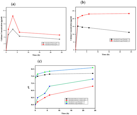 It is crucial to determine nCA’s interaction with different biological fluids to assess potential risks in the environmental medium. The nCA nanocarrier dissolution study was carried out in vitro using simulated plasma solution (SPS) and simulated lung fluid (SLF). The nCA was immersed at two different pH levels, 7.4 and 5.5, within different time intervals to study the concentration of calcium released. Figure 11a,b demonstrate higher dissolution profiles and higher calcium concentrations in acidic simulated plasma solution, similarly to simulated lung fluid.