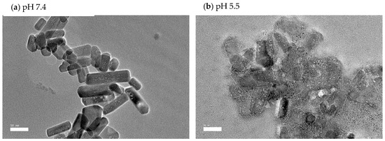 The pH levels of all samples were determined to evaluate the alkalisation or neutralisation ability of the nCA, as shown in Figure 10c. The alkalisation abilities of the nCAs in both media were higher at pH 5.5 than at physiological pH 7.4. Ishikawa et al. [58] have proposed that carbonated hydroxyapatite nanoparticles increased the pH to about 7.4. The buffering capacity of nCA in both solutions at different pH levels confirms the nCA’s ability to alkalise the tumour microenvironment, which will help to decrease metastasis and tumour growth [58,59]. Since the function of calcium is the intracellular signal transducer, the extra calcium release from nCA may affect cellular signalling via increasing endoplasmic reticulum (ER) stress and induction of reactive oxygen species (ROS). However, calcium is the lowest toxic metal among others such as Ni2+, Cu2+, and Zn2+, even though it is an essential metal inside the human body and plays a critical role in regulating metabolism [59]. The FESEM micrographs of nCA in simulated lung fluid confirm the distortion of nanoparticles with reducing pH, as shown in Figure 12a,b.