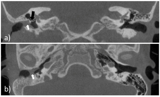 Cone beam computed tomography imaging of the temporal bone of the patient. (a) Coronal view of the external ear canal with the white arrowhead pointing to the restenosis; an aerated middle ear space and a middle ear partial ossicular replacement prosthesis (black arrowhead); (b) axial view of the external ear canal with the partial restenosis (white arrowhead).