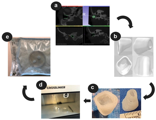 Development of a 3D-printed external ear canal implant (EECI). (a) Manual segmentation of the area to be implanted (green); (b) digital model of the EECI exported as STL data; (c) 3D-printed EECI; (d) irradiation of the implant using the UV crosslinker; (e) irradiated implant packed in the autoclaved pouch.