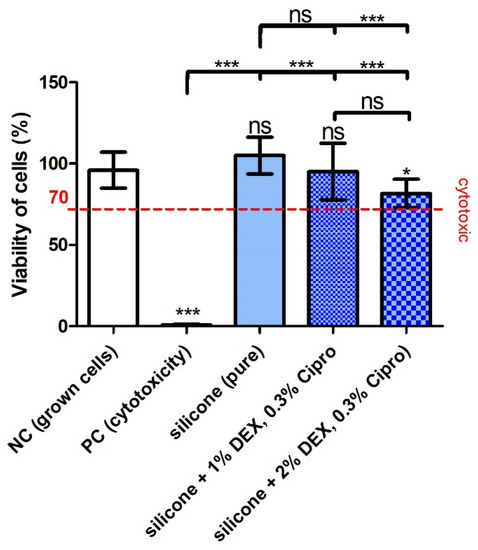 Cell viability results of fibroblasts treated with the supernatant of the different conditions. The positive control (PC) showed a massive and significant reduction of cell viability compared to the NC and silicone groups, indicating the cytotoxic effect of DMSO and proving that the test was appropriately performed. There were no significant differences detectable between the negative control (NC) and the silicone groups except for silicone with 2% dexamethasone (DEX). This higher amount of included DEX also reduced the cell viability compared to pure silicone, while this was not the case for 1% DEX. A viability of 70% (red line) is labeled to mark the cut-off for the cytotoxic effect of materials (ISO 10993-5:2009). Only the PC showed a cell viability below this mark. Data are given as mean ± standard deviation (SD) and significances are labeled with *** p < 0.001, * p < 0.05, and ns: not significant. Significances marked above the error bar refer to the NC. N = 1; n = 3 (NC, PC), n = 9 (silicone, silicone DEX 1%, cipro 0.3%, silicone DEX 2%, cipro 0.3%).