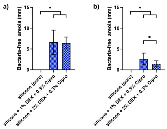 To test for antibacterial activity of the DEX- and cipro-loaded UV–silicone, a standardized bacteria-free areola test was performed. For both bacterial strains, S. aureus (Figure 5a) and P. aeruginosa (Figure 5b), clear growth inhibition zones could be observed with silicone loaded with cipro and both 1% and 2% DEX. In contrast, no growth inhibition was detected for pure UV–silicone. The differences were statistically significant with p values from 0.006 t < 0.0001. Bacteria-free areolas were greatest for S. aureus with no difference between 1% and 2% DEX loading. For P. aeruginosa, inhibition zones were in general smaller than for S. aureus. Furthermore, the diameter of the bacteria-free areola was significantly smaller for 1% DEX than for 2% DEX (p = 0.03). Thus, silicone loaded with 1% DEX and 0.3% cipro exhibited the strongest antibacterial effect.