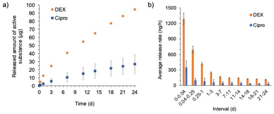 The release profiles of the active ingredients DEX and cipro from the EECI model are shown in Figure 6 in total (Figure 6a) and as an average mass released per time within the sampling interval (Figure 6b).