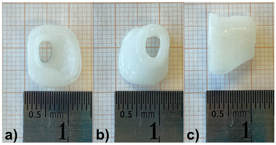 The patient-individualized DEX- (1%) and cipro- (0.3%) containing hollow EECI with a wall thickness of 1.5 mm after the printing process. (a) Top view of the side of the implant facing the opening of the EEC; (b) top view of the side of the implant facing the tympanic membrane; (c) side view of the implant showing its height.