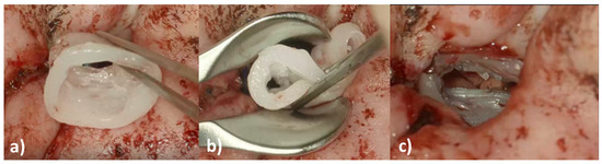 Intraoperative images of the insertion of the 3D-printed, individualized, drug-releasing EECI. (a) After surgically removing the stenosis of the EEC, the EECI was inserted in the right position according to the patient’s anatomy; (b) the texture of the implant was deformable for better handling while insertion with the forceps; (c) perfectly fitted implant in the EEC of the patient.