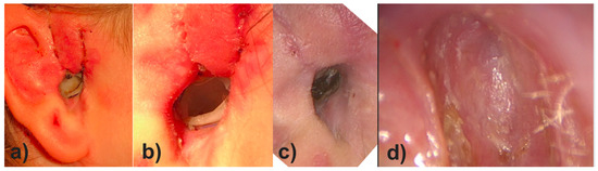 Postoperative images of the EEC of the patient during the follow up visits. (a) Averview of the auricle and EEC with the implant in situ two weeks postoperatively; (b) close-up of the EEC with the well adapted implant in situ three months postoperatively right before explantation; (c) the EEC four weeks after explantation of the implant (i.e., four months after implantation) without clinical signs of inflammation; (d) close-up of the EEC one year after surgery: the EEC shows a good patency and view on the TM after total reconstruction of the TM with Tutoplast® Fascia lata and perichondrium.