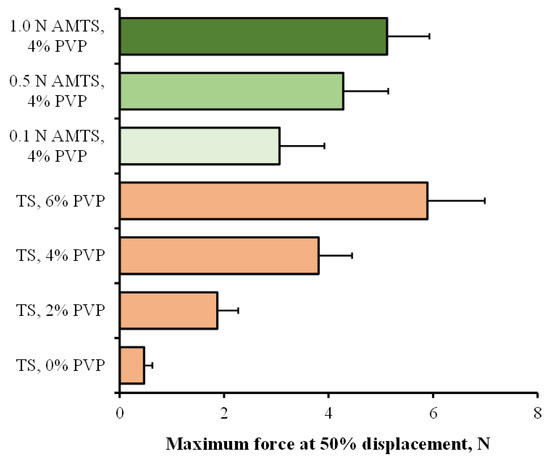 The particle strength of the agglomerates was measured by using the maximum force at 50% displacement as a parameter for evaluation, as shown in Figure 2. The force at 50% displacement obviously increased with increasing PVP content, indicating an enhancement in the strength of the TS agglomerates. This result was in agreement with previous studies [5,28,29]. The PVP solution added could create a thin film (liquid bridge in the wet state) to induce an adhesion of starch granules, leading to the formation of capillary forces and strong solid bridges due to binder hardening after drying [21,30]. Thus, the addition of PVP, which acts as an agglomerating agent, could increase the particle strength of the TS agglomerates, which is dependent upon the concentration of PVP. In the case of the AMTS agglomerates, the 0.1 N AMTS agglomerates showed lower strength than the TS agglomerates. However, the particle strength of the AMTS agglomerates tended to increase with increasing HCl concentrations for starch modification. The 1.0 N AMTS agglomerates with 4% PVP presented the highest particle strength. These results could be explained by the characteristics of the AMTS after using different acid concentrations of modification. The higher the HCl concentrations were, the greater the percent relative crystallinity of the AMTS. This phenomenon resulted in an increase in the powder compressibility of the AMTS [19]. Thus, the increase in acid concentration also brought about a greater particle strength of the AMTS agglomerates.