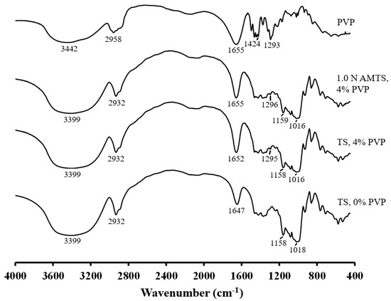 The FTIR spectrum of TS showed an O–H stretching peak at 3399 cm−1, C–H stretching peaks at 2932 cm−1, and O–H bending of water residues at 1647 cm−1, as presented in Figure 3. Moreover, the C–O stretching, C–C bending and O–H asymmetric stretching of the C–O–C glycosidic bond appeared at approximately 1018–1158 cm−1. The AMTS also presented the same FTIR spectrum as TS, which was reported previously [19]. The FTIR spectrum of PVP could be identified as follows: the O–H stretching at 3442 cm−1, the C–H stretching of the CH2 and ternary CH groups at approximately 2958 cm−1, the C=O stretching in the pyrrolidone group at 1655 cm−1, the CH deformation modes from the CH2 groups at approximately 1424 cm−1, and the C–N bending of the pyrrolidone structure at 1293 cm−1, which were similar to previous reports [31,32]. The TS and 1.0 AMTS agglomerates with 4% PVP gave a similar FTIR pattern. Two changes could be found when compared with those without PVP. The first was the shift of the O–H bending peak of the TS and 1.0 N AMTS agglomerates with 4% PVP to a higher wavenumber, suggesting that the water residues of the starch interacted with the carbonyl groups of PVP. This result confirmed hydrogen bond formation. Second, the small peak of C–N bending of PVP appeared at 1295–1296 cm−1 in the spectra of TS and 1.0 N AMTS agglomerates, although PVP was incorporated in a very small amount.