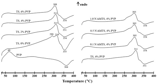 The DSC thermograms of the TS and AMTS agglomerates are shown in Figure 4. The TS agglomerates without PVP presented two endothermic peaks at 290 and 316 °C, indicative of the phase transition or melting of the amorphous region in the starch lamellae structure [19]. The exothermic degradation peak was also found at 355 °C. PVP presented a melting peak at 69 °C, followed by a degradation peak at 364 °C. The addition of PVP caused a single endothermic peak of the TS agglomerates, which moved to a lower temperature with increasing PVP content. The degradation temperature of the TS agglomerates with PVP was over the range of 351–354 °C. Moreover, no PVP melting peak appeared. This may be due to the small amount of PVP added. However, the thin film of PVP on the surface of the starch granules could possibly melt, inducing the phase transition of the starch lamellae structure. In addition, PVP molecules interacted with water residues in the starch granules, which was revealed by FTIR study and influenced this transition at higher temperatures. Apart from the TS agglomerates, the DSC thermograms of the AMTS presented two endothermic peaks at approximately 255–309 °C and the degradation peak at 354–357 °C that was reported previously [19], similar to that of the TS agglomerates without PVP. The phase transition temperature of the AMTS agglomerates was lower than that of the TS agglomerates. The change in the internal structure of the starch granules after acid hydrolysis may bring about the phase transition at lower temperatures induced by the same amount of PVP. Therefore, these findings indicated that the FTIR pattern and thermal behavior of the TS and AMTS agglomerates could be changed when PVP was added.