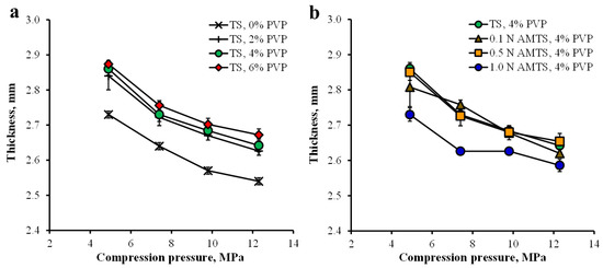 Thickness-compression pressure profiles of TS agglomerates using various concentrations of PVP (a), and AMTS agglomerates using 4% PVP (b). Each point is the mean ± S.D., n = 5.