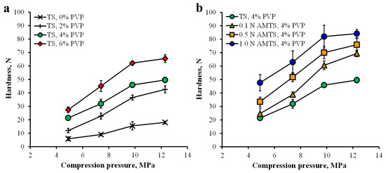 Hardness-compression pressure profiles of TS agglomerates using various concentrations of PVP (a), and AMTS agglomerates using 4% PVP (b). Each point is the mean ± S.D., n = 5.