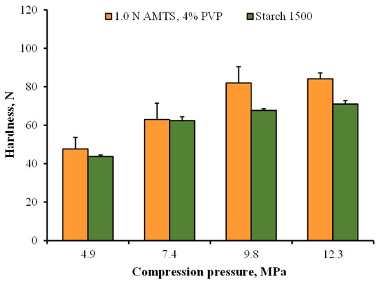 Tablet hardness of Starch 1500® and 1.0 N AMTS agglomerates compressed at different pressures. Each value is the mean ± S.D., n = 5.