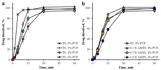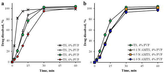 For the PPN dissolution test, the drug dissolution profiles in 0.1 N HCl are presented in Figure 8. Complete drug dissolution was found within 30 min of the test in acidic medium, and a similar result was also obtained in neutral medium (Figure 9). The slowest drug dissolution of the TS agglomerate tablets with 6% PVP could be observed in Figure 8a. Additionally, a longer T50% of the TS agglomerate tablets was found when increasing PVP contents (Table 2), suggesting that higher tablet hardness affected the drug dissolution of these tablets. The 1.0 N AMTS agglomerate tablets provided the slowest drug dissolution and the longest T50%, as shown in Figure 8b and Table 2, respectively. This result was influenced by the highest tablet hardness in the AMTS agglomerates used. In addition, the dissolution medium used in this study affected the disintegration time and drug dissolution rate of the agglomerate tablets (Figure 9a,b). The slightly longer disintegration time and the slightly slower drug dissolution rate of the tablets in pH 6.8 phosphate buffer were obtained when compared with using 0.1 N HCl, which was similar to a previous report [19].