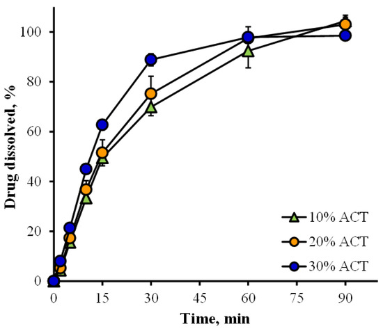ACT dissolution profiles of the 1.0 N AMTS agglomerate tablets containing various contents of ACT. Each point is the mean ± S.D., n = 3.