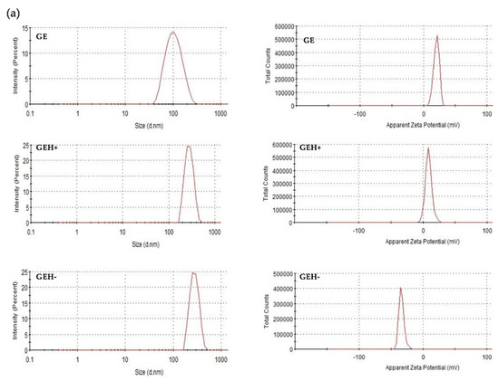 The size and surface charge (zeta potential) were determined via DLS (data shown in Table 1). The GE-NPs were positively charged (20.4 mV), with a size of ~100 nm. With HA addition, both GEH+ (273.20 ± 3.22 nm) and GEH− (353.50 ± 28.54 nm) became larger than the GEs. With different amounts of HA addition, the zeta potential of the 62.5 μg/mL HA addition is +9.16 mV (GEH+), and −35.4 mV for the HA addition at 167 μg/mL (GEH−). Larger particle size and more negative charged NPs were observed. The polydispersity index (PdI) of all NPs was <0.4, confirming that the NPs were well suspended. The size distribution and zeta potential pattern in a single peak of GE, GEH+, and GEH- NPs were observed (Figure 2a). The morphology of both positive NPs (GE) and negative NPs (GEH−) were round spheres with no aggregation (Figure 2b,c). The shape of GEH+ NPs was similar to that of the other two (not shown here). In addition, a shell layer was observed in GEH−, and it is speculated that the HA coating appeared on the surface.