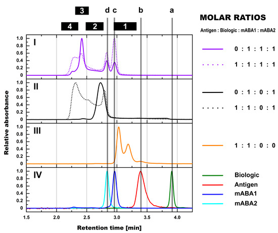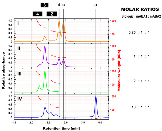 - The most simple test concept between a monomeric biotherapeutic and anti-biotherapeutic mAbs highlights the necessity for having at least two anti-biotherapeutic antibodies, which recognize different and non-overlapping epitopes, to generate ICs larger than a 1:1 biotherapeutic:Ab complex. Alternatively, for multimeric biotherapeutics like therapeutic mAbs, an ADA against a single epitope on the therapeutic mAb is sufficient for the formation of high MW ICs by cross-linking of multiple therapeutic Abs and multiple ADAs. As expected, for the monomeric biologic used in this study, in the presence of two mABAs, which recognize non-overlapping epitopes, the highest amount of ICs (=full conversion of single components) was observed for the equimolar 2:1:1 molar ratio (Figure 10). Under these conditions, also the amount of ICs with higher MW was largest, but decreased dramatically with a molar excess of either the biologic or the mABAs.
