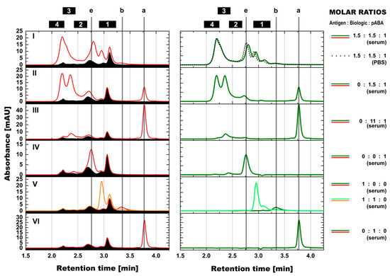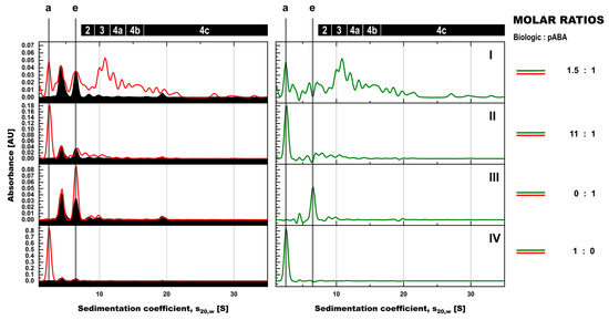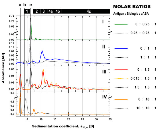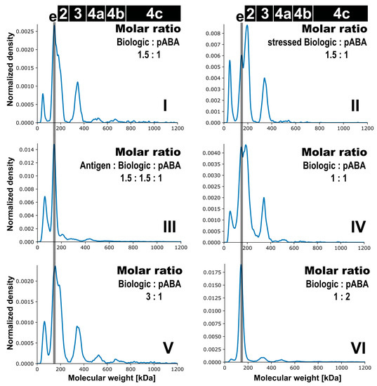 - In addition to the molar ratio, the absolute concentration of the components is a critical factor for IC formation. The analysis of ICs at low µmolar to high nanomolar (SEC and SV-AUC results) and at low nanomolar (mass photometry) concentrations showed a direct correlation between the concentration and the amount of formed ICs. Hereby, the reduction was relatively more pronounced for the amount of larger ICs (>2 pABAs incorporated) compared to the amount of smaller ICs. The analysis of ICs at low nanomolar concentrations is generally preferable due to a higher relevance for physiological conditions. A significant factor with the potential to impact IC formation and its composition is the KD of ADA molecules to the corresponding target biotherapeutic. At least for low-affinity ADAs (early during the immune response), the KD is reported to be in the medium to low nanomolar range [32]. Not being in the scope for this study, it can be envisioned that fitting of such experimental IC formation data will be of benefit for setting up adverse events evading drug dosing regimens. A direct analysis of the ICs at physiological concentrations without modification of the involved components is a breakthrough and although requiring further refinement, i.e., increasing the precision for the quantification of individual IC species, the new approach we used in this work will significantly change analytics in the field of (immune) complex formation.