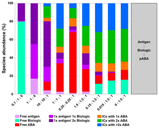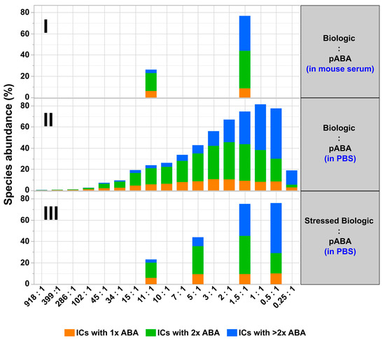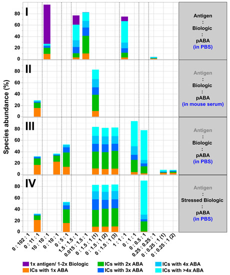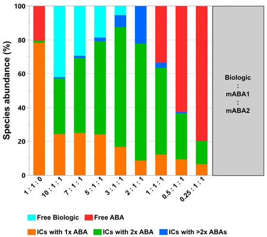 - The expansion of the simplistic model through the exchange of mABAs by surrogate pABAs, which have the potential to cover a broader epitope space, increases the number of options to generate new and more complex forms of ICs. In our hands, the highest levels of ICs were observed at or near to equimolarity between the biologic and the pABA (Figure 11 and Figure 12) in agreement with published data on other IC systems [23]. Our experiments indicate that the most stable complex is formed by cross-stabilization of IC species containing 2 ABAs, presumably avidity driven by all four Fab-arms being involved in the interaction with the biologic molecules. Surprisingly, a non-Gaussian distribution of IC content was observed measuring the abundance of ICs at various molar ratios between the biologic and pABA (Figure 11). The presence of ICs could be detected even at a ~1000-fold molar excess of the biologic over pABA. In contrast, the content of ICs decreased rapidly with molar excess of pABA over the biologic and could not be detected below an excess of pABA of 5-fold (Figure 11 and Figure 12). The ratio between the components was not only dictating the conversion rate of free components to ICs, but had a significant impact on the dynamic distribution between the individual IC species. The amount of smaller ICs, which contain one to two pABA molecules, was highest at a slight molar excess of the biologic (2:1 ratio), and were generally the dominating species at molar excess of the biologic. In contrast, the larger ICs (≥3 pABAs) became the dominant species with molar excess of pABA over the Biologic. The highest amount of larger ICs was observed for the 0.5:1 ratio at non-physiological concentrations.