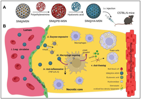 Schematic illustration of construction of SIM@HA-MSN for atherosclerosis management. (A) Scheme of fabrication process and administration route of SIM@HA-MSN. (B) Illustration of SIM@HA-MSN therapy which can potentially alleviate atherosclerosis through long circulating, enzyme-responsive drug release, macrophage targeting, and anti-inflammatory and anti-foaming effects. (Created by Biorender).