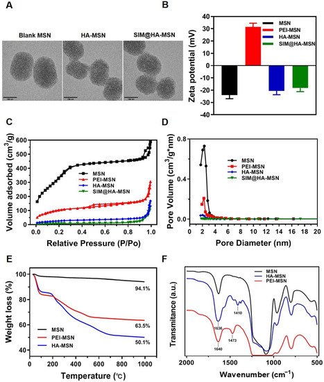 Physicochemical characterizations of MSN-based nanosystems. (A) TEM images (scale bar = 100 nm), (B) average zeta potentials, (C) N2 adsorption–desorption isotherms, and (D) the pore size distributions of bare MSN, PEI-MSN, HA-MSN, and SIM@HA-MSN. (E) TGA analysis and (F) FT-IR spectra of MSN, PEI-MSN, and HA-MSN.