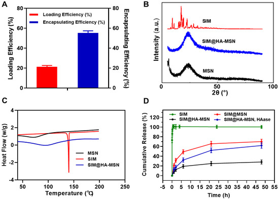 (A) Loading efficiency (LE%) and encapsulating efficiency (EE%) of SIM@HA-MSN (n = 3). (B) XRD spectrum and (C) DSC analysis of bare MSN, SIM, and SIM@HA-MSN. (D) In vitro drug release of free SIM, SIM@MSN, and SIM@HA-MSN in the presence or absence of HAase (100 U/mL) (n = 3).