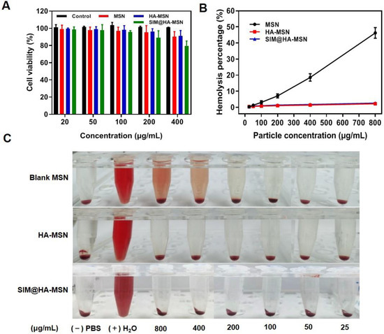 Subsequently, a hemolysis assay was conducted to evaluate the hemocompatibility of the particles (Figure 4B,C). Since the damage of RBCs could induce the release of hemoglobin, the hemolysis rate was determined by measuring the absorbance of hemoglobin in the supernatant at a wavelength of 576 nm. The results showed that the hemolysis rate of MSN was dose-dependent and increased to as high as 46.24 ± 3.92% at 800 μg/mL (Figure 4B) with notable hemolysis of RBCs (Figure 4C). In contrast, there was no obvious hemolysis of RBCs and negligible hemolytic rate for HA-MSN and SIM@HA-MSN (<5%). This result revealed that SIM@HA-MSN had superior hemocompatibility compared with bare MSN due to the shielding effect of HA, which was consistent with the previous report [44].