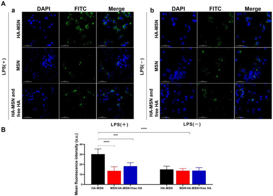 (A) Confocal laser microscope images of Raw264.7 cells treated with FITC-labeled HA-MSN, MSN, and free HA + FITC-HA-MSN for 2 h with (a) or without (b) LPS activation. (B) Mean fluorescence intensity of FITC-HA-MSN, FITC-MSN, and free HA + FITC-HA-MSN after cellular uptake (n = 3). Variance among groups was determined by one-way ANOVA with Tukey post-hoc test (*** p < 0.001, **** p < 0.0001).