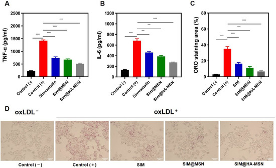Quantification of proinflammatory cytokines (A) TNF-α and (B) IL-6 secreted by Raw264.7 cells after different treatments at equivalent SIM concentrations for 24 h (n = 3). (C) Quantification of oil red O staining areas and (D) oil red O staining optical microscopy images of Ox-LDL-induced foam cell formation after various treatments at equivalent SIM concentrations for 24 h (n = 3). Variance among groups was determined by one-way ANOVA with Tukey post-hoc test (*** p < 0.001, **** p < 0.0001).