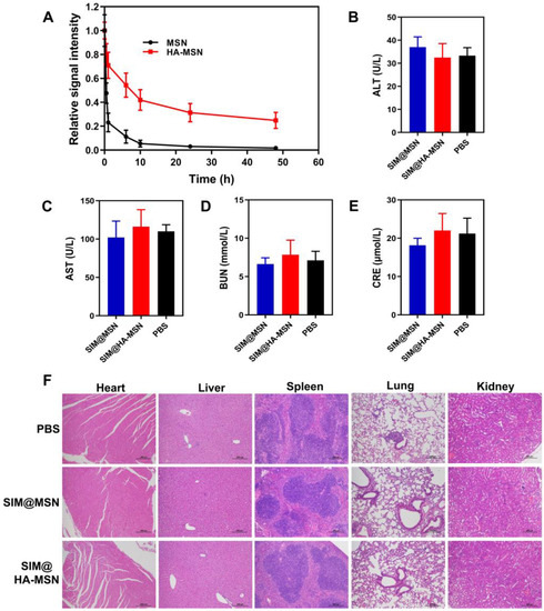 MSNs are extensively investigated in the field of drug delivery and biomedical engineering, but they are rarely reported for CVD treatment due to their potential toxicity. Herein, liver function, pathological changes of major organs, organ index, and body weights were monitored and evaluated after repetitive injections of SIM@HA-MSN at a therapeutic dose of SIM (15 mg/kg) for one month, which was frequently adopted for SIM-loaded nanotherapeutics to achieve desirable anti-atherosclerosis efficacy according to previous reports [48,49]. SIM@MSN was investigated at the same time as both nanomaterials and the fabrication process could potentially bring in toxicity in vivo. As shown in Figure 7B–E, serum biochemistry analysis showed normal levels of creatinine (CRE), aspartate aminotransferase (AST), alanine aminotransferase (ALT), and urea nitrogen (BUN) levels in the SIM@HA-MSN and SIM@MSN groups, suggesting that the functions of liver and kidney were well preserved after one month of treatment. In parallel, no obvious pathological changes or injuries were observed from H&E-stained sections of major organs including heart, liver, spleen, lung, and kidney derived from mice after treatment with SIM@MSN or SIM@HA-MSN (Figure 7F) compared with the PBS group. Moreover, the organ index and body weights of the mice were also comparable to that of the PBS group, further confirming their biosafety in vivo (Figures S9 and S10). Therefore, the absence of in vivo toxicity or side effects after intravenous administration of therapeutic doses for a month implicated that SIM@HA-MSN can be a safe candidate for atherosclerosis therapy.