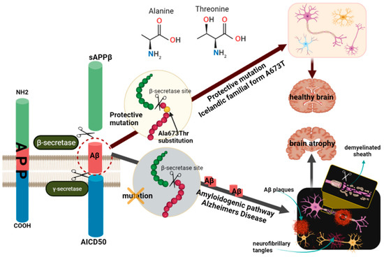 A673T mutation, also known as A2T (rs63750847), is an alanine to threonine substitution at amino acid 673 of APP, protective not only against AD development but also cognitive decline in the elderly in general [41]. This substitution is adjacent to the β-secretase cleavage recognition site (Figure 2) and lies in position 2 of the Aβ1-xx peptide cleavage product (A2T). These data suggest that the 673 amino acid position could be critical for the selection of the BACE1 cleavage site during APP processing [33,78,79].