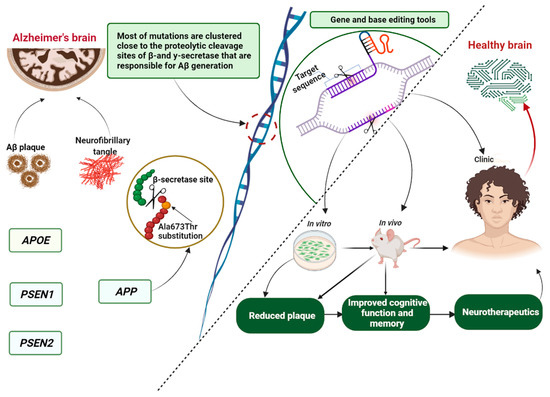 The genetic influence on AD is strong, and genomic data may provide not only insights into the molecular mechanisms underlying the pathogenesis of the disease, but also a perspective on AD prevention and therapy [39,40]. The mutation known as A673T has been shown to decrease the production of Aβ [41]. People carrying this variant present negligible cerebral amyloid deposition, even at the age of 95 [42]. This mutation reduces aggregation of Aβ and the BACE1 cleavage in APP by 40%. It is related to longevity, given that the carriers of A673T are 50% more likely to reach the age of 85 when compared to controls [43]. Confirming this statement, Kero et al. [44] identified a 104.8-year-old A673T mutation carrier, who later died with minor Aβ pathology and a score of zero on the Consortium to Establish a Registry for Alzheimer’s Disease (CERAD) scale. One of the newly developed and most effective pieces of gene editing technology, clustered regularly interspaced short palindromic repeats (CRISPR), gained attention for possible benefits in the fields of basic research and disease therapeutics. This extremely powerful tool can be used as an approach to targeted therapy, to construct better models that mimic human diseases, to uncover novel biological mechanisms or to help screen for pathogenic/protective genes. Moreover, it has proven to be promising for other neurodegenerative conditions, such as Huntington’s and Parkinson’s diseases [45,46,47]. In this evolving landscape, our approach aimed to highlight a cross-disciplinary state-of-art update of the translational literature on the involvement of the A673T mutation in amyloid pathology, focusing on its roles in protective mechanisms against AD, in relation to the recent status of available therapeutic editing tools.
