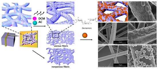 There is a need for specific drug carriers that can protect and deliver these ADs effectively. Carriers are generally used in the form of capsules, porous fibers, and core-shells as they allow the ADs to remain unaltered, survive severe body conditions, and release their contents at the desired time. Among these carriers, electrospun fibers have been studied for many decades as no additional chemical reactions are required during electrospinning and there are no alterations to the chemical structure of antibiotics [8]. Electrospinning produces fibers with varied morphologies and high surface-to-volume ratios by controlling processing variables, such as flow rate, voltage, distance between a nozzle and a collector, nozzle types, humidity, concentrations, and polymer–solvent selection [9]. An additional benefit of this method is the ability to induce porosity in fibers, which provides additional sites for antibiotic adsorption [10]. Increased porosity of fibers results in increased surface area and volume, leading to improved effectiveness of carrying antibiotics [11]. Additionally, the morphology of porous fibers influences the release characteristics of antibiotics, including diffusion, release periods, degradation, and bursting release at the initial stage [12].