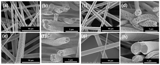 SEM images of porous and non-porous PLA microfibers in different polymer–solvent systems: (a) 5:5 PLA, (b) the cross-section of 5:5 PLA, (c) 6:4 PLA, (d) the cross-section of 6:4 PLA, (e) 7:3 PLA, (f) the cross-section of 7:3 PLA, (g) non-porous PLA, and (h) the cross-section of non-porous PLA.